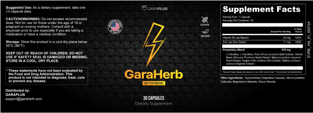 GaraHerb is a premium male performance supplement formulated to reignite stamina, enhance blood flow, and help you perform at your peak. It’s soy-free, dairy-free, vegetarian, non-GMO, and every batch is tested by third-party labs to guarantee purity and potency. Proudly manufactured in the USA in a GMP-certified facility, GaraHerb is produced using cutting-edge technology under the strictest safety and hygiene protocols. As always, consult your doctor before starting any new supplement, especially if you’re on medication or have an existing condition.